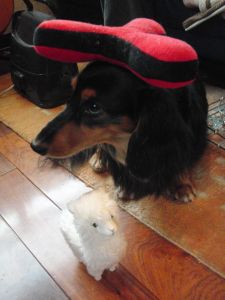 おもちゃをくわえたハルは、追いかけられると 水を得た魚のようにダイニングテーブルと椅子が作るたくさんの小さな隙間をすごい速さでくぐりぬける。