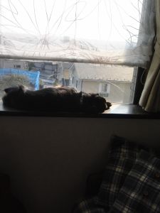 その後もハルがひとりでに出窓に寝そべっているのを何度も目撃しているにもかかわらず、私がいると、あの表情 あの格好 あの声で私に甘え攻撃をかけるのだ。