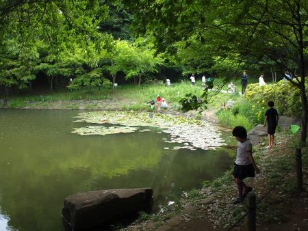 池には睡蓮が花をつけ始め、ご家族連れが楽しそうに水ぎわにしゃがんでいた。