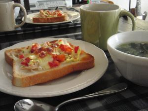 ある物のっけただけで・・パンにマーガリンぬって、スライスたまねぎ少量、ツナ缶の汁気をのぞいてパラパラとまぶし、その上に意外だと思うけど えのき を粗い碁盤の目になるように乗っけてみた。そしてトマトをダイスに切ったものとチーズをのせて、あとはオーブントースターに。 人の好みだと思うけど、えのきとチーズ、意外においしかった。あとはほうれん草と卵のスープ。
