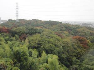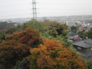 マンションの、渡り廊下から見下ろす公園の木々が 色づき始めています。
