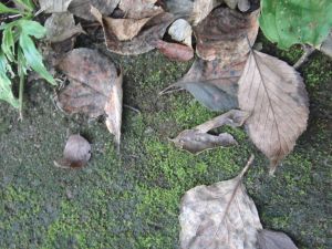遊歩道の両端が、苔むした緑のビロードをのせて、またその上を 濃淡の茶色絵の具が点在するかのように枯葉が重なり合い、細長ーい額縁のふち飾りを成していた。