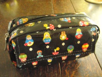 濃紺のような黒地に カラフルなマトリョーシカがポーチの隅々まで楽しそうに並んでいる。よーく見ると、不規則に ねずみやたぬきのマトリョーシカがお茶目な感じで紛れ込んでいる。