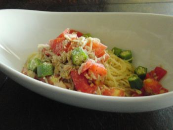 ケンタロウさんと太一くんの 「男子ごはん」でやっていた「冷たいトマトのカッペリーニ」を私がまねて作ったのを機に、イタリアンレストランの厨房でバイト経験のある娘が手馴れた感じでツナとトマトとオクラ入りのそれを さっと作ってくれた。